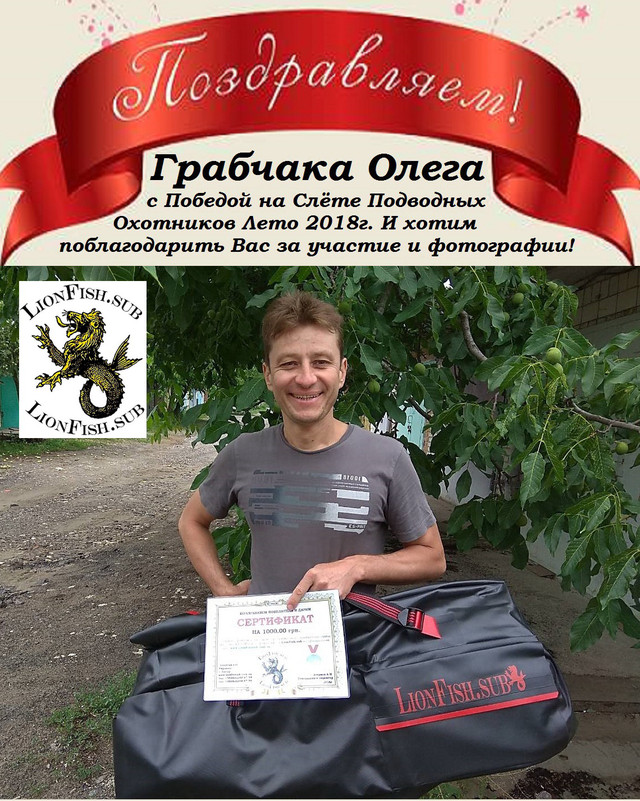 LionFish.sub виступив одним із спонсорів на щорічному літньому Зльоті Підводних Мисливців та Рибалок аматорів, місце проведення - база «Три Ведмедя», Сокирне, Черкаська область. Вперше в історії призовий фонд на зльоті 40000 грн!!! Цікаві конкурси для підводних мисливців і не тільки! Розіграші, лотереї, аукціони та ще багато всього цікавого! Також для всіх холодне розливне пиво та квас (для учасників конкурсів безкоштовно)! LionFish.sub вітає і чекає всіх переможців, щасливих володарів нашого подарункового сертифікату на придбання якісної і функціональної продукції! Ми вітаємо Вас з перемогою! І Чекаємо На Вас! А так, же хочемо подякувати організаторам, колег і всіх ділянок за чудовий настрій, незабутній захід, за хороший відпочинок в компанії приємних людей! Було весело!!! Всім велике спасибі від компанії "LionFish.sub".